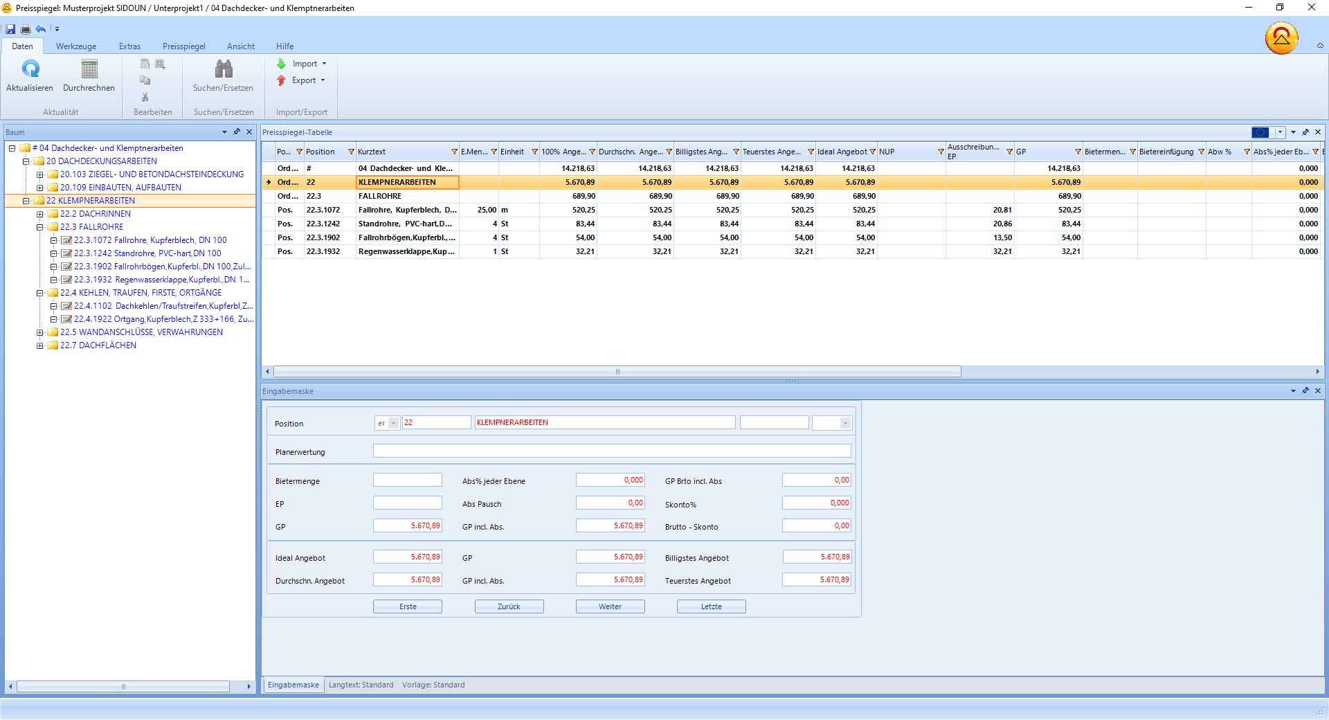 Die Ansicht „Preisspiegel“ ermöglicht eine komplexere Betrachtung von Bieterangeboten und stellt mehrere Informationen bereit: Durchschnittliches Angebot, günstiges/teures Angebot… Dazu kommen die detaillierteren, expliziten Bieterdaten (Einheitspreise, Gesamtpreise, Bietermengen, Abschläge, etc. ). Die Ansicht „Preisspiegel“ bietet Ihnen vielfältige Auswertungskriterien sowie eine GAEB-Schnittstelle.